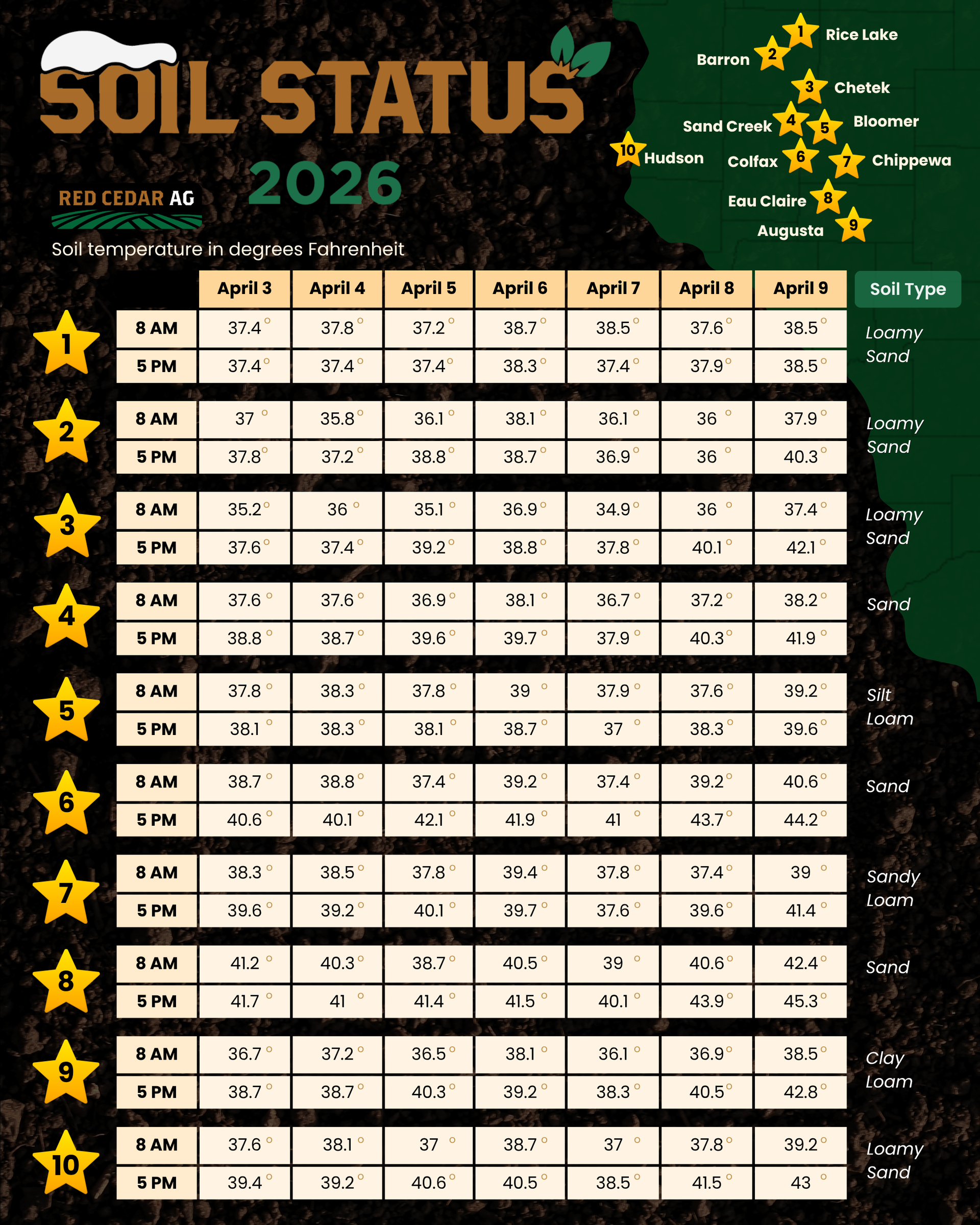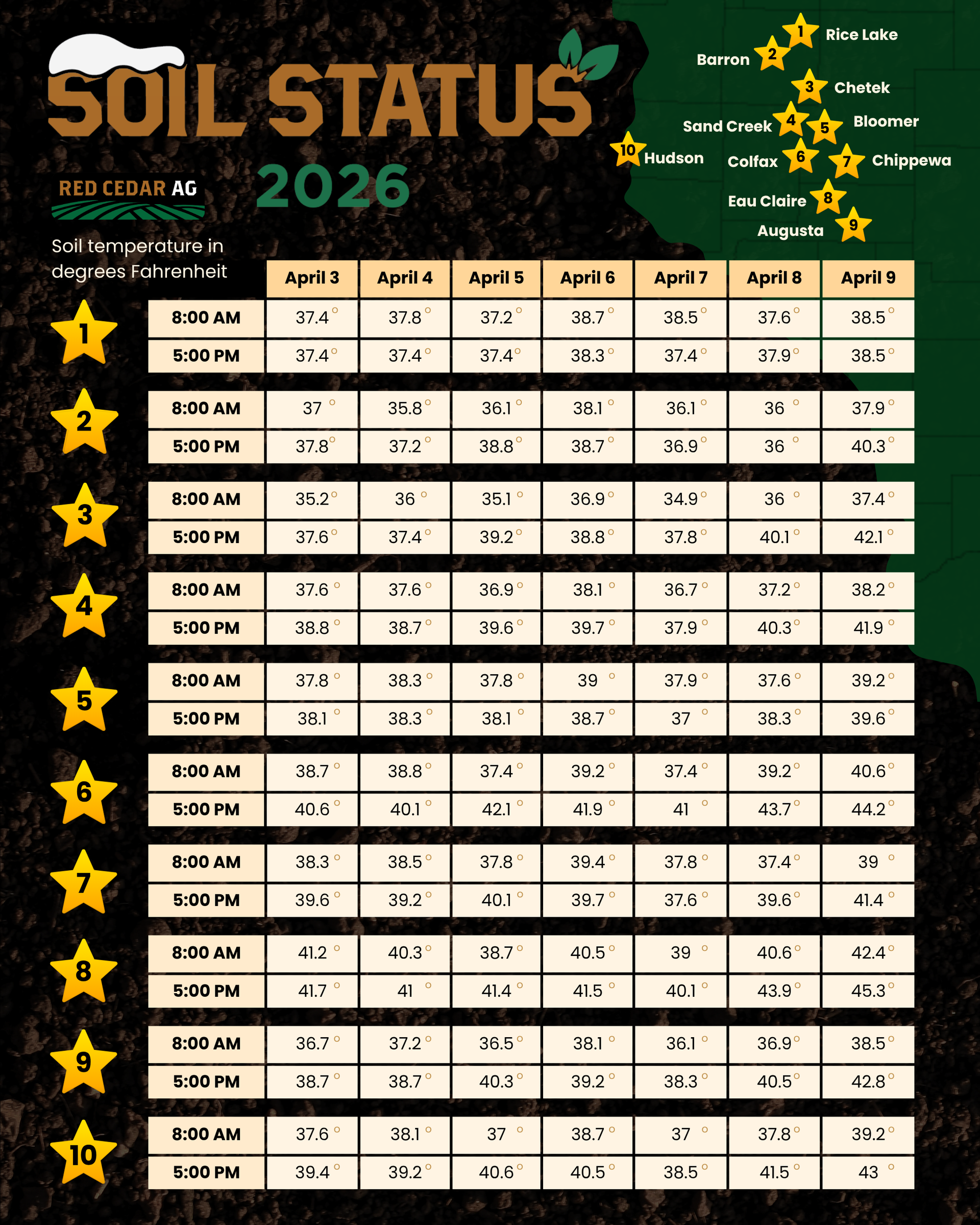 That’s why Red Cedar Ag is tracking weekly soil temperatures across Northwest Wisconsin to help growers better understand how the season is progressing.